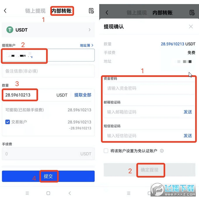 2.内部转账:打开欧易APP,选择【资产】栏 ―【提现】―选择币种【USDT】―选择【内部转账】―输入【提现账户】―【数量】―【提交】―按要求获取并输入相关密码/验证码―【确定提现】,完成操作。