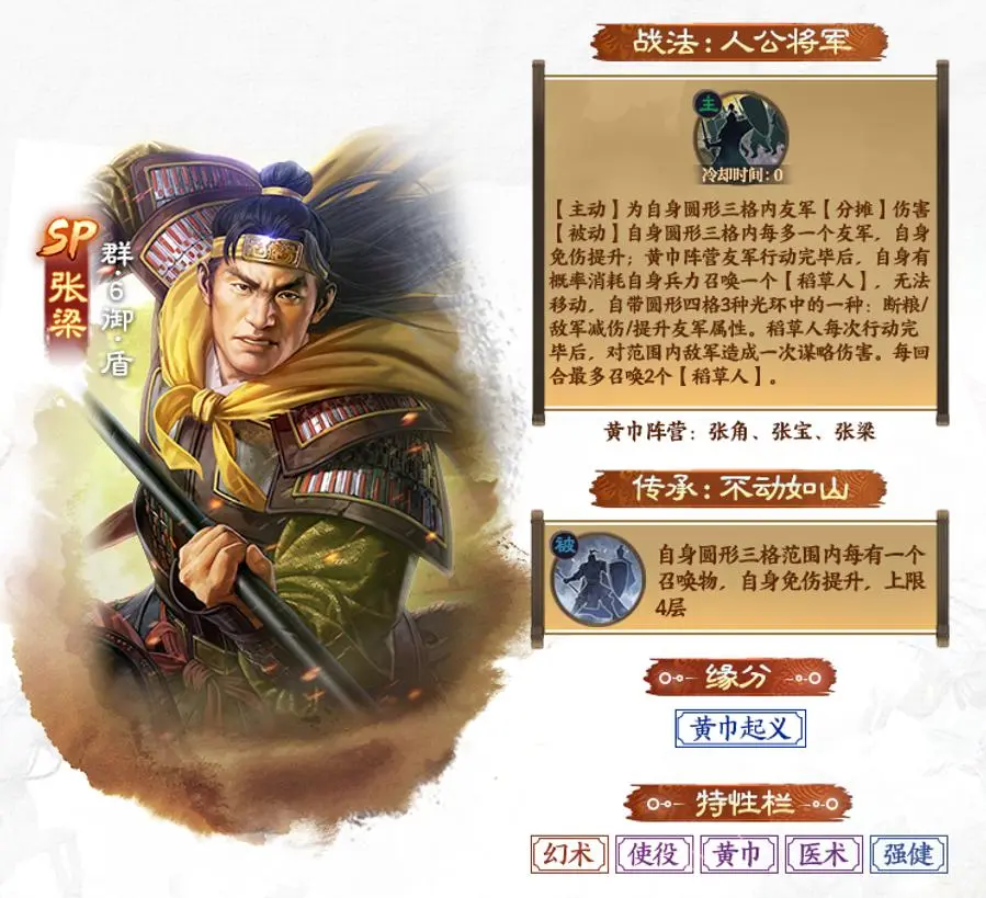 SP张梁,群阵营的6御盾兵,自带战法【人公将军】是一个0CD主动战法,效果如下: