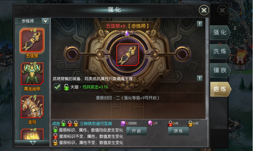 2. 洗练属性中有三个属性必须为兵种的加成,这三个就是对应你的武将所带的兵种,分别有(骑兵,弓兵,步兵)一定要洗练到你相对应的兵种,若你的武将带的是骑兵,就一定要把4件装备洗练到骑兵的加成,给武将最大值的(生命,防御,攻击加成)。