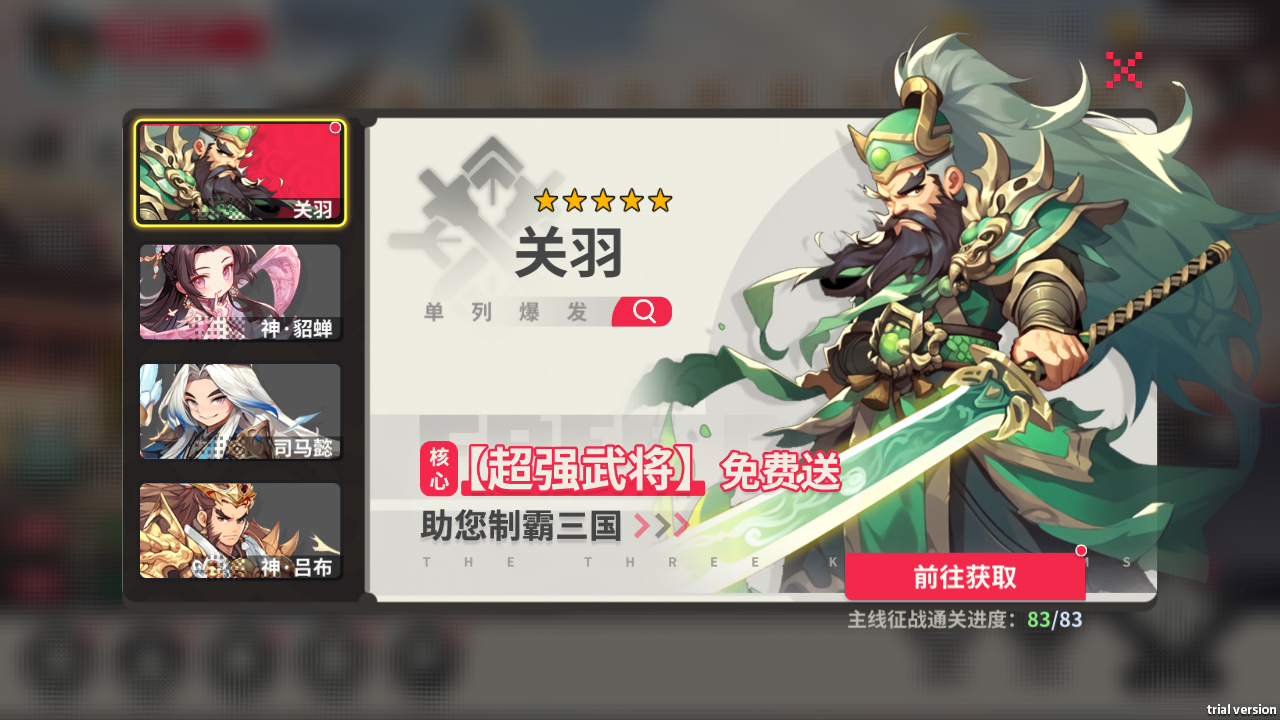 完成指定任务可得强力五星武将关羽、司马懿、神·貂蝉以及神·吕布,助主公,制霸三国。