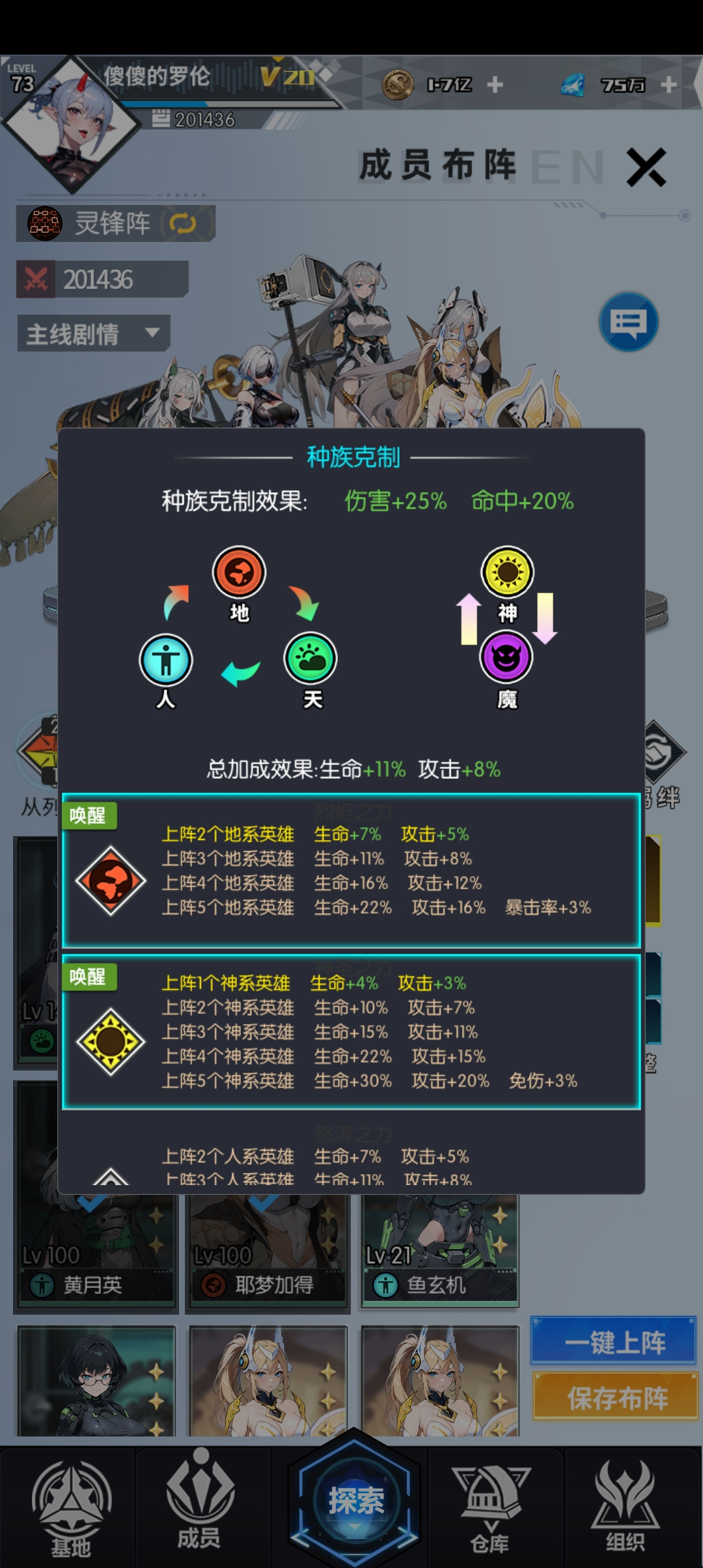 英雄分天、地、人及神、魔五个种族,种族之间有克制效果,部分英雄有羁绊加成;